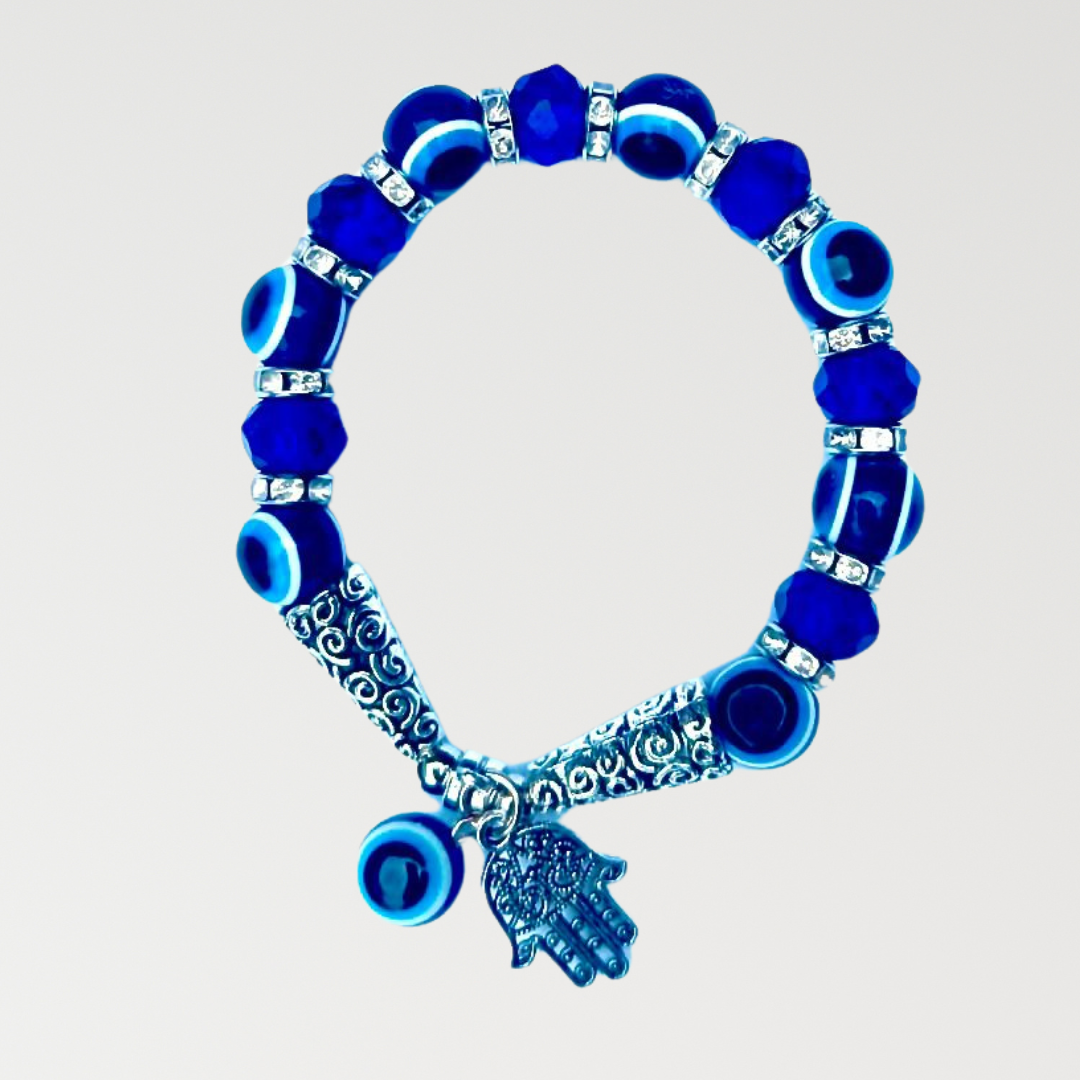 Stay protected and stylish with this handcrafted Evil Eye Bracelet. Made with deep blue beads and a Hamsa charm, it helps keep away negativity and brings good luck.